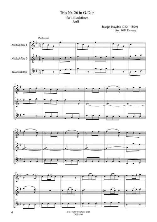 Haydn, Joseph - Trio Nr. 26 in G-Dur  für 3 Blockflöten (AAB)
