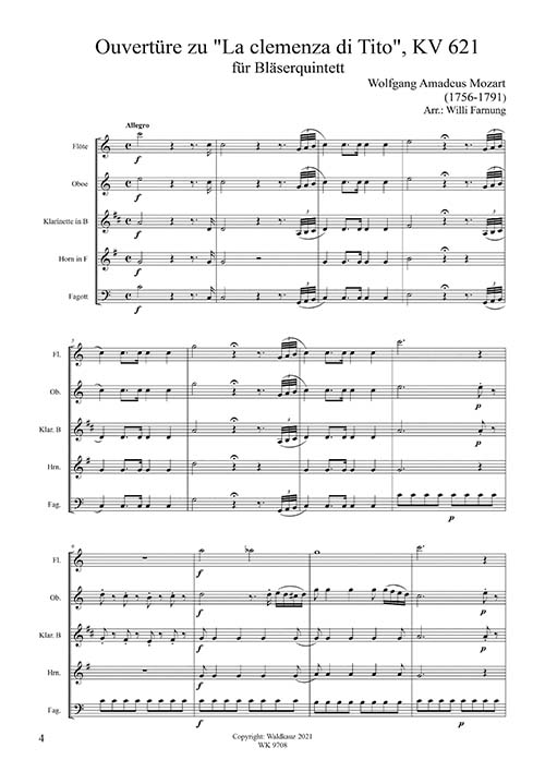 Mobile Preview: Mozart - Ouvertüre zu La clemenza di Tito - für Bläserquintett