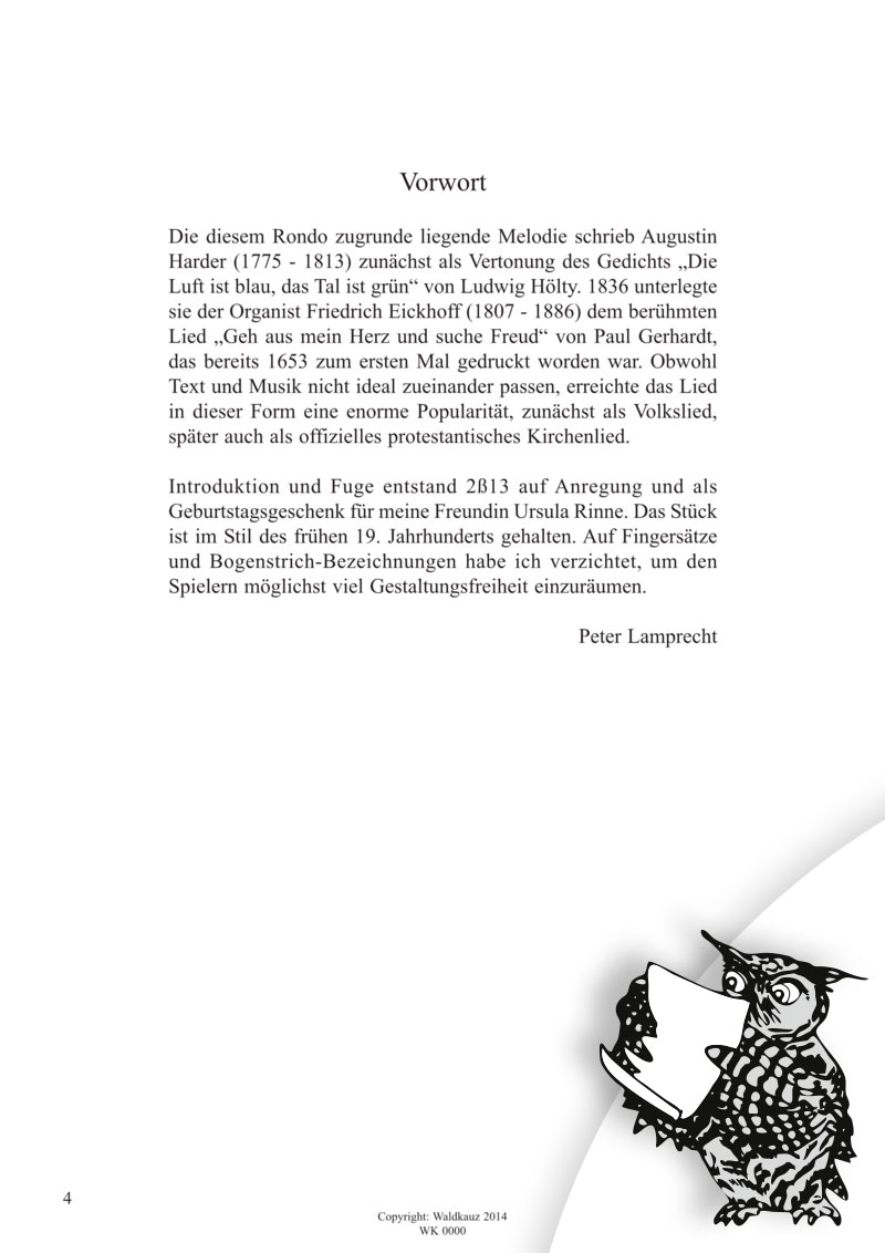 Introduktion und Fuge entstand 2ß13 auf Anregung und als Geburtstagsgeschenk für meine Freundin Ursula Rinne. Das Stück ist im Stil des frühen 19. Jahrhunderts gehalten. Auf Fingersätze und Bogenstrich-Bezeichnungen habe ich verzichtet, um den